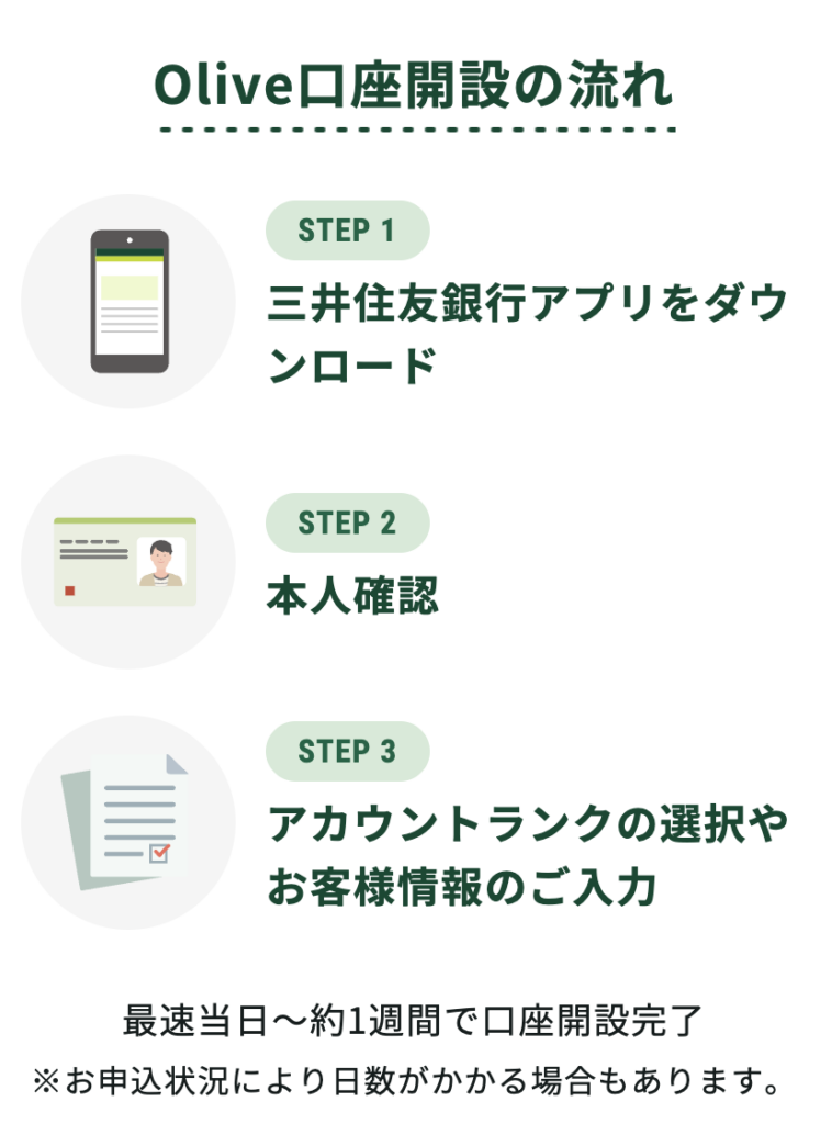 Olive 一般のカード発行には、三井住友銀行の口座開設、Oliveアプリのダウンロードが必要になります。