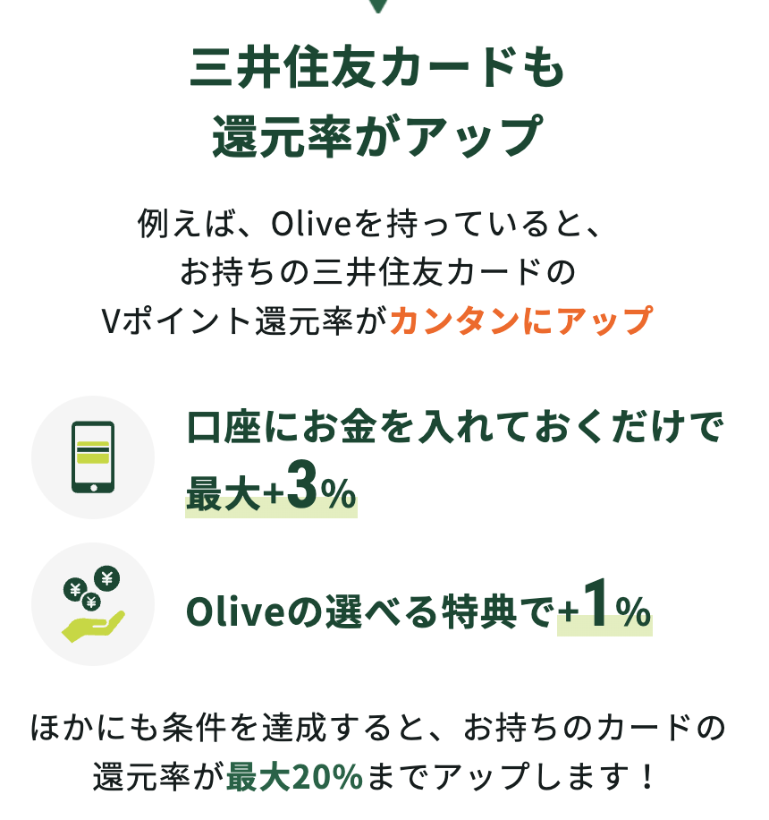 ただし、Olive 一般を保有しているだけでも、口座の残高による加算(最大3%)と選べる特典(1%)で、+4%のポイント加算は狙えるため、三井住友カードVisa infiniteとOlive 一般を2枚持ちをするメリットは大いにあるでしょう。