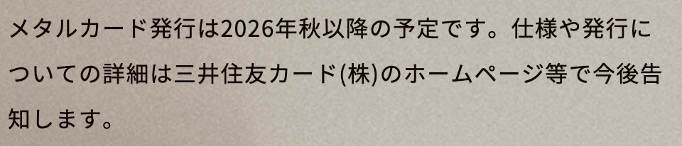 Olive infiniteの内容通りとなれば、三井住友カードVisa infiniteも2026年秋以降にメタルカードの発行が始まる可能性が高いと考えられます。