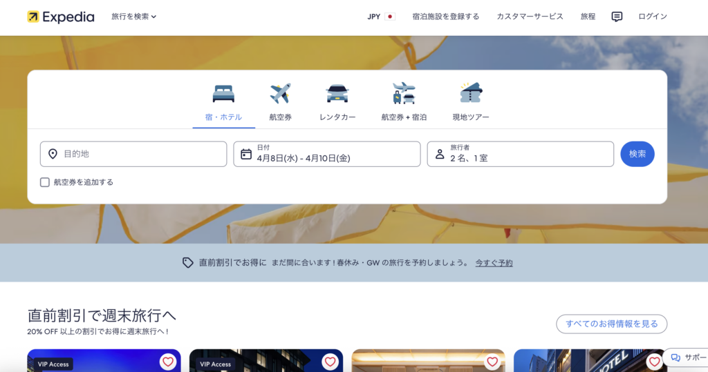 リワードアップVisa infiniteの対象店舗であるExpediaは、国内外のホテル予約、航空券、レンタカーの予約が叶う旅行予約サイトです。