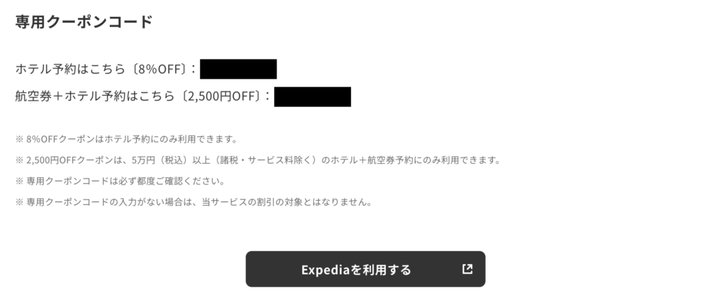 ただし、三井住友カードVisa infiniteの会員専用サイト「For Visa Infinite Members」内にはExpediaで利用できるクーポンコードの発信などもあり、ポイント還元ではなく割引という形でお得に旅行予約が叶う可能性があります。