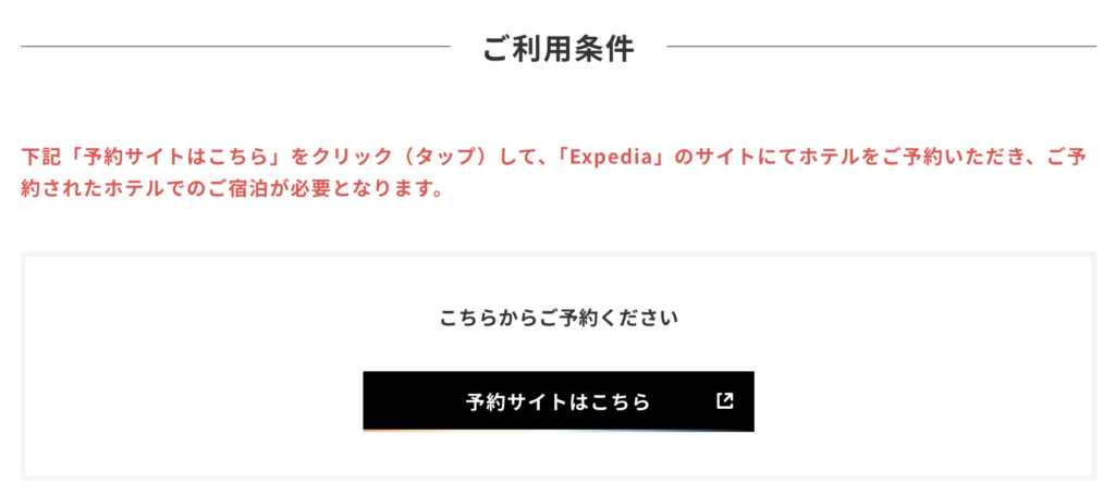 「For Visa Infinite Members」の経由なしでExpediaのサイトから予約した場合やアプリから予約を行った場合、10%のポイント還元にはならないため注意が必要です。