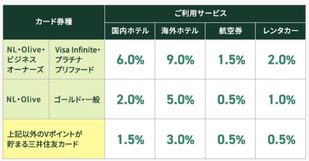 三井住友カードVisa infiniteは、三井住友カードの旅行予約サイトVトリップでの旅行予約で最大10%のポイント還元を受けることができます。