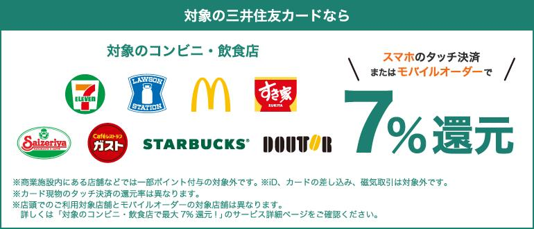 三井住友カードVisa infiniteは、セブン‐イレブン・ローソン、マクドナルドなどの対象店舗で、最大7%のポイント還元が受けられます。