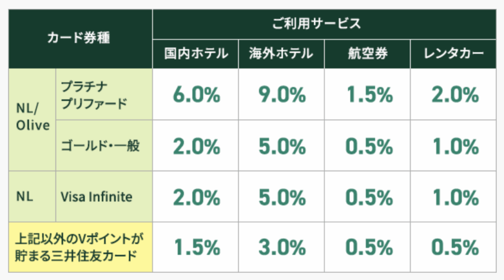 三井住友カードVisa infiniteは、旅行予約サイトVトリップでのホテル、航空券の予約で最大6%のポイント還元を受けることができます。
