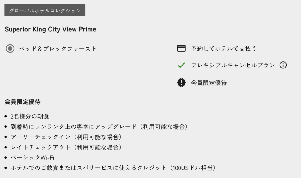 「グローバルホテルコレクション」の特典が付帯していない客室予約のみのシンプルなプランも用意されており、こちらのプランの場合、楽天トラベルなどの旅行予約サイトよりも1泊あたり1万円ほど割安なお値段となっていました。