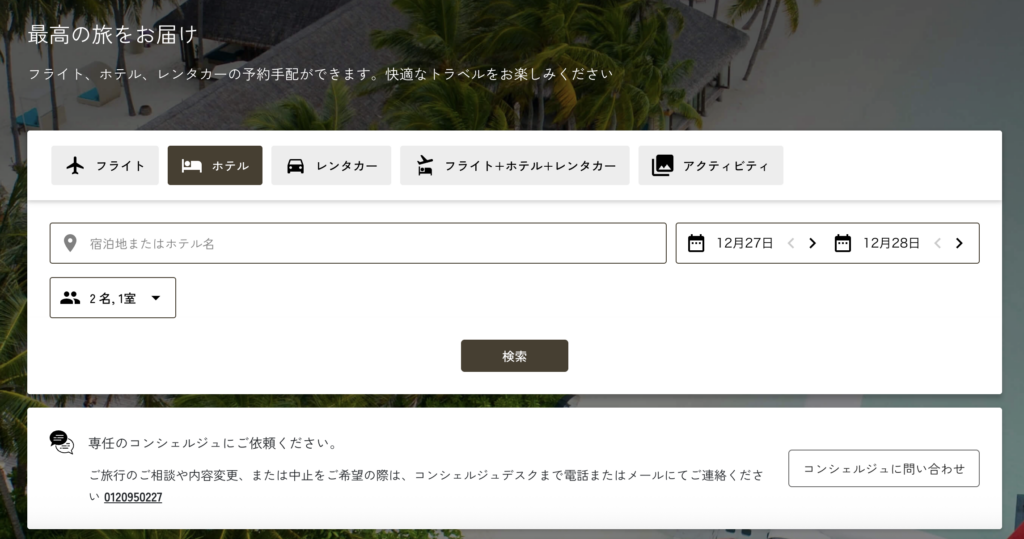 今回のハワイ旅行は、飛行機の予約は事前に済ませていたため、ホテル予約のみを三井住友カードVisa infiniteのコンシェルジュサイト経由で行うことにしました。