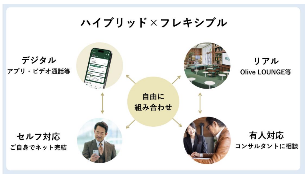 1つの相談チャネルで、ネット証券、大手証券会社、メガバンク3つのサービスを利用できるのは、Olive infiniteフレキシブルコンサルティングの大きな魅力といえます。